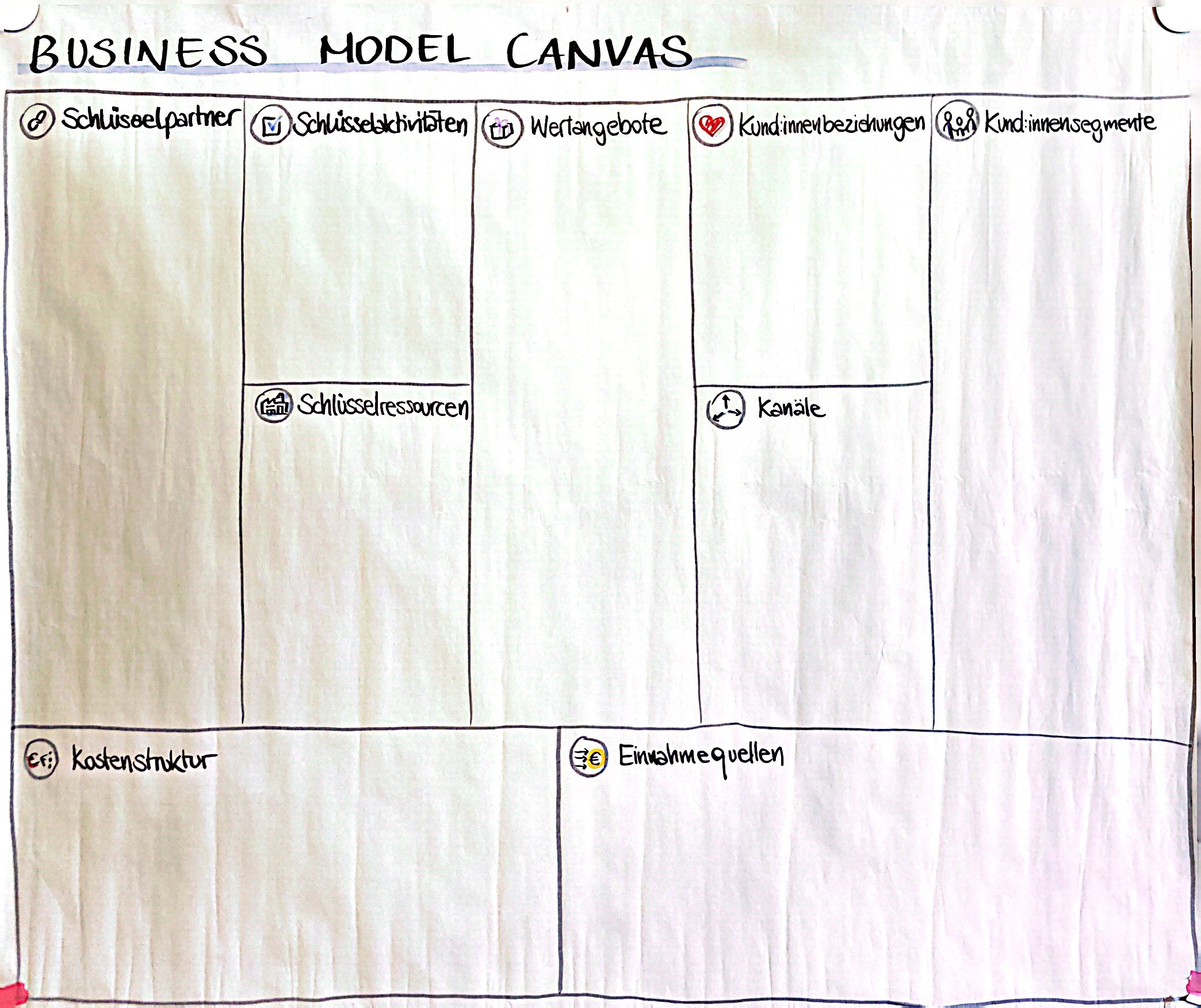 Das Business Model Canvas ist ein Werkzeug, um ein Geschäftsmodell übersichtlich darzustellen. Es besteht aus neun Bausteinen, die die wichtigsten Aspekte eines Unternehmens beschreiben: Schlüsselpartner, Schlüsselaktivitäten, Schlüsselressourcen, Wertangebote, Kund:innenbeziehungen, Kanäle, Kund:innensegmente, Kostenstruktur und Einnahmequellen. Diese Bereiche werden auf einer einzigen Seite visualisiert, um das Geschäftsmodell einfach zu analysieren und weiterzuentwickeln.